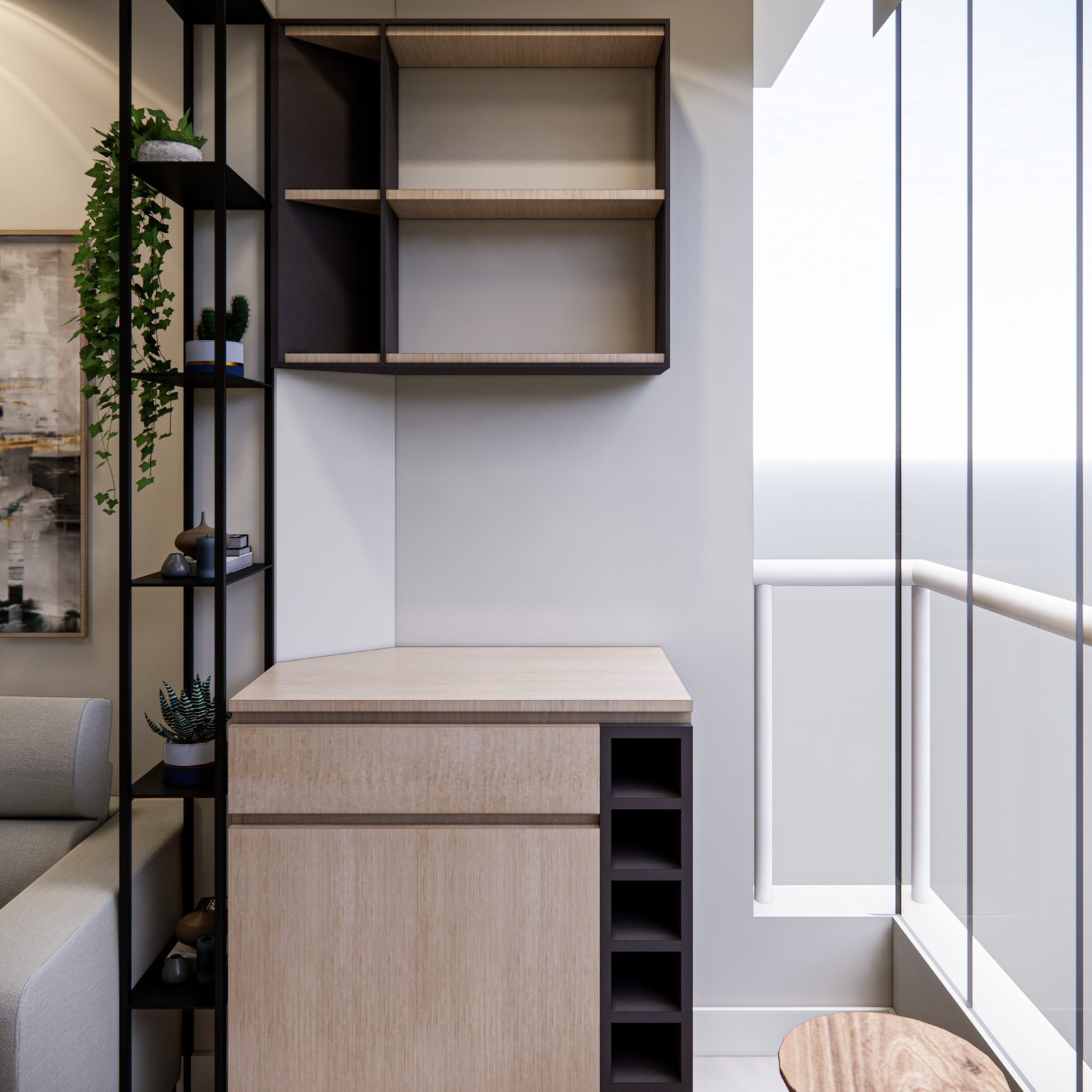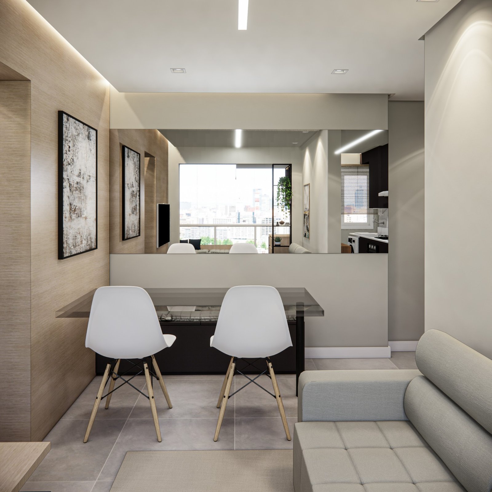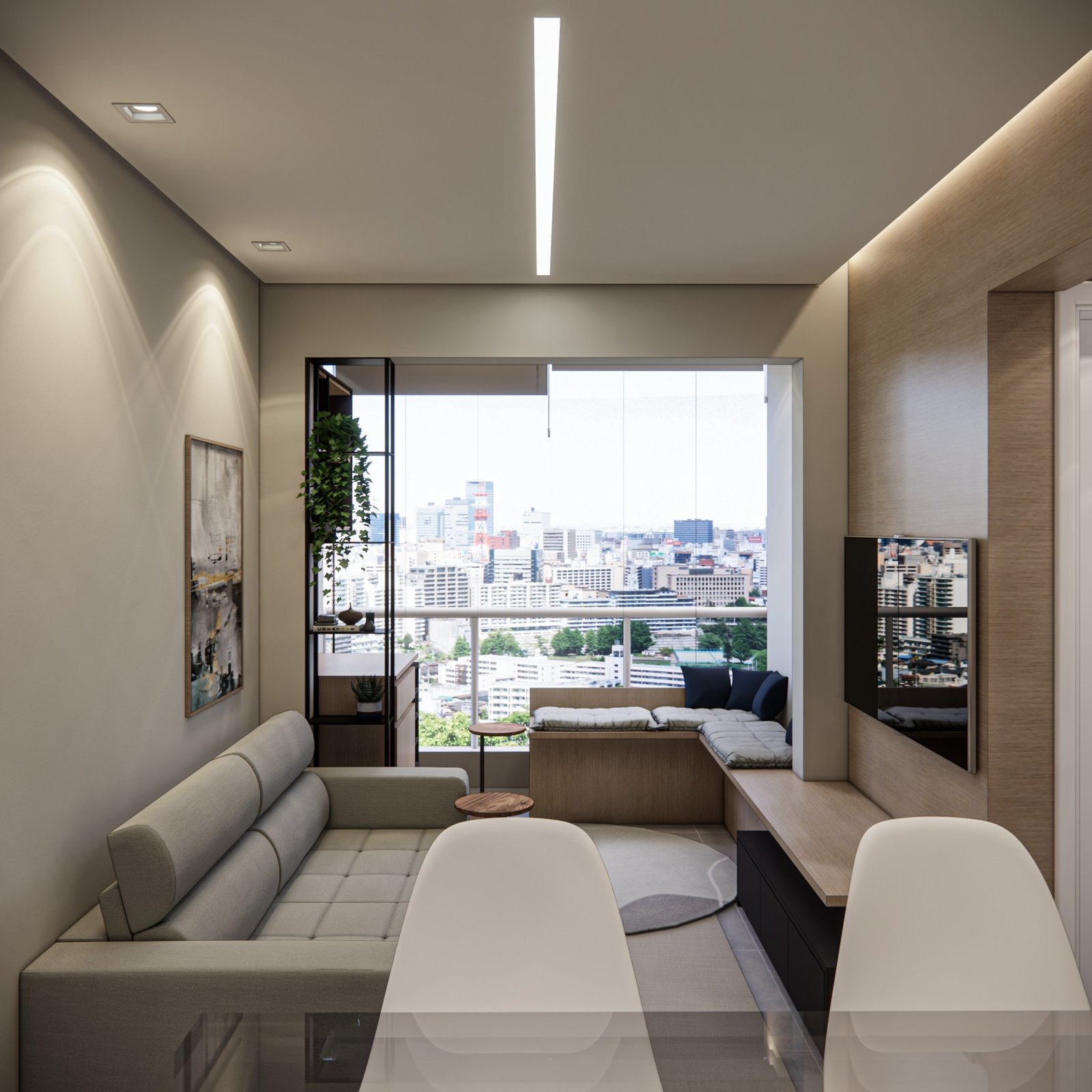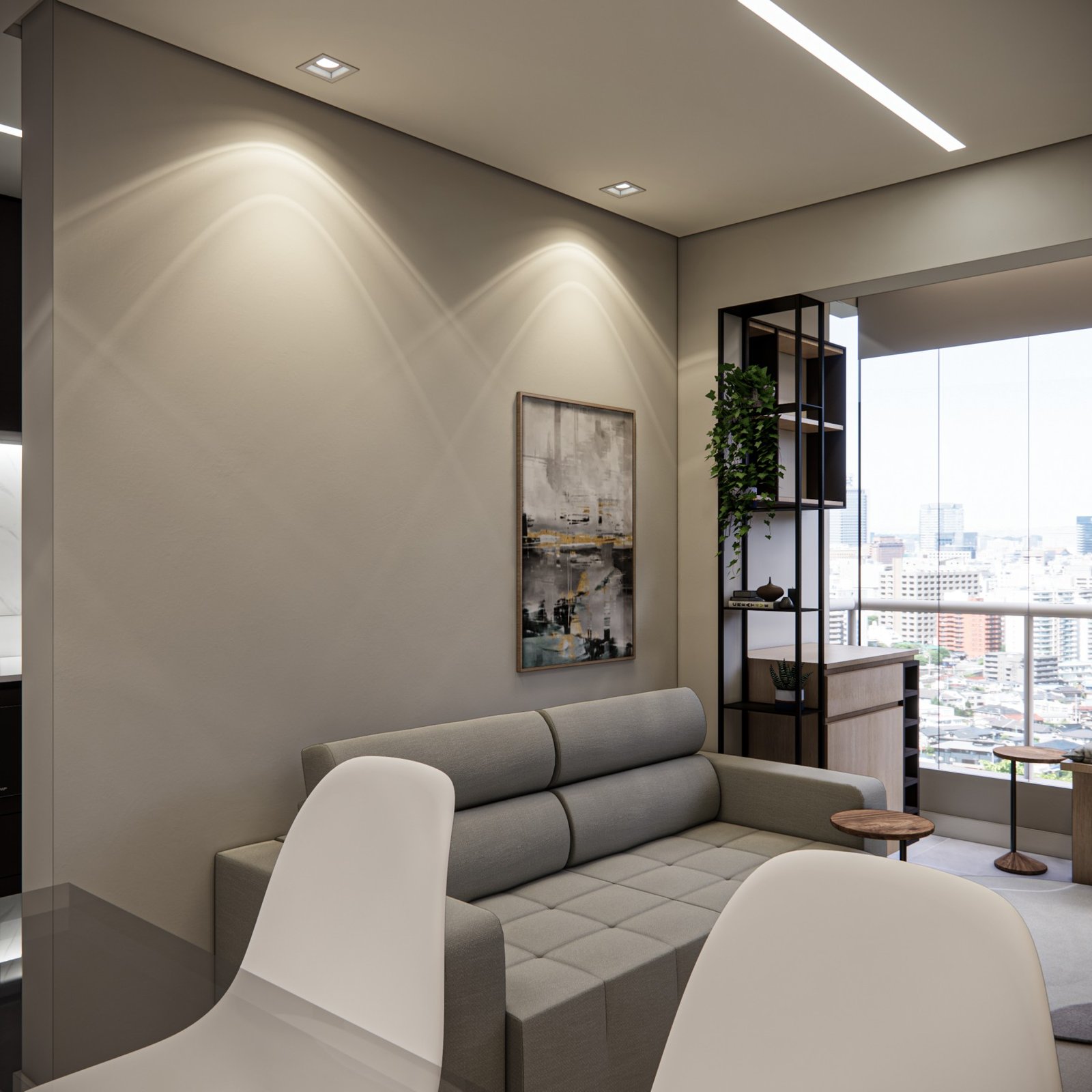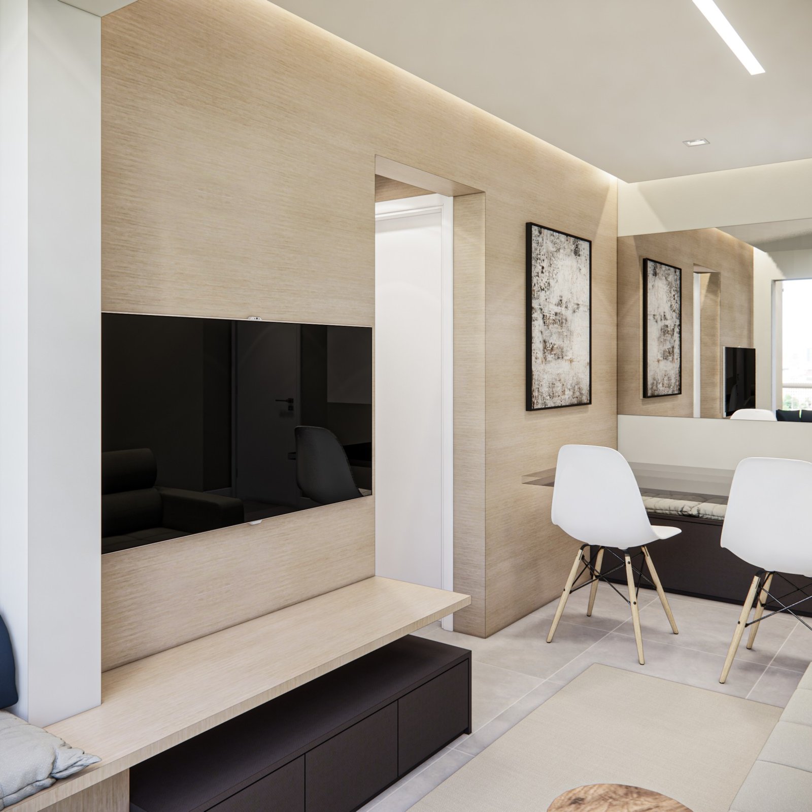 Este apartamento de 45 m² está localizado em Osasco. Optamos por usar bastante marcenaria para criar diferentes funcionalidades nos ambientes, garantindo que cada espaço tenha um uso específico. Os acabamentos são em tons neutros, com algumas cores escolhidas para adicionar personalidade ao lugar. Além disso, utilizamos quadros e uma iluminação que combina funcionalidade, conforto e um toque intimista.