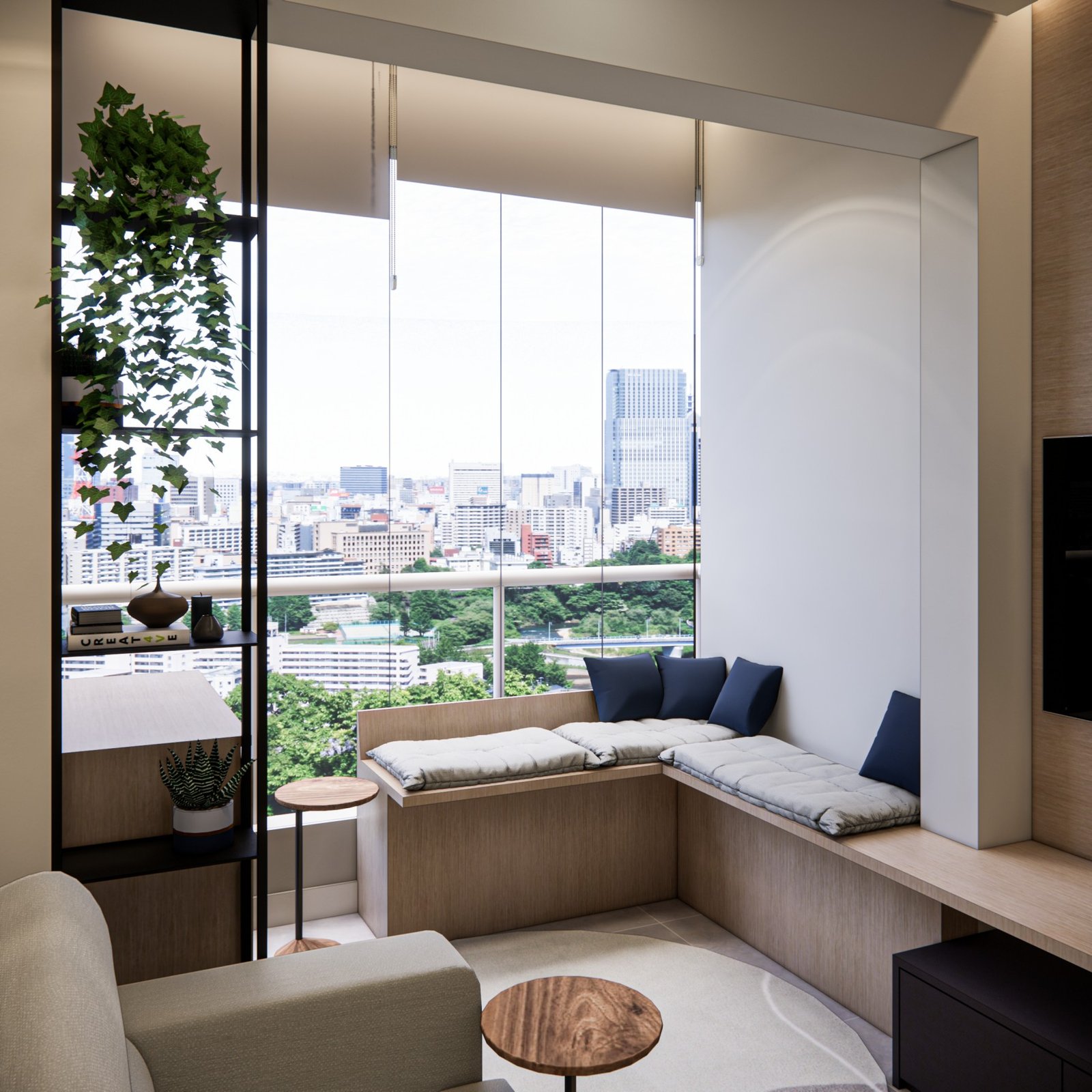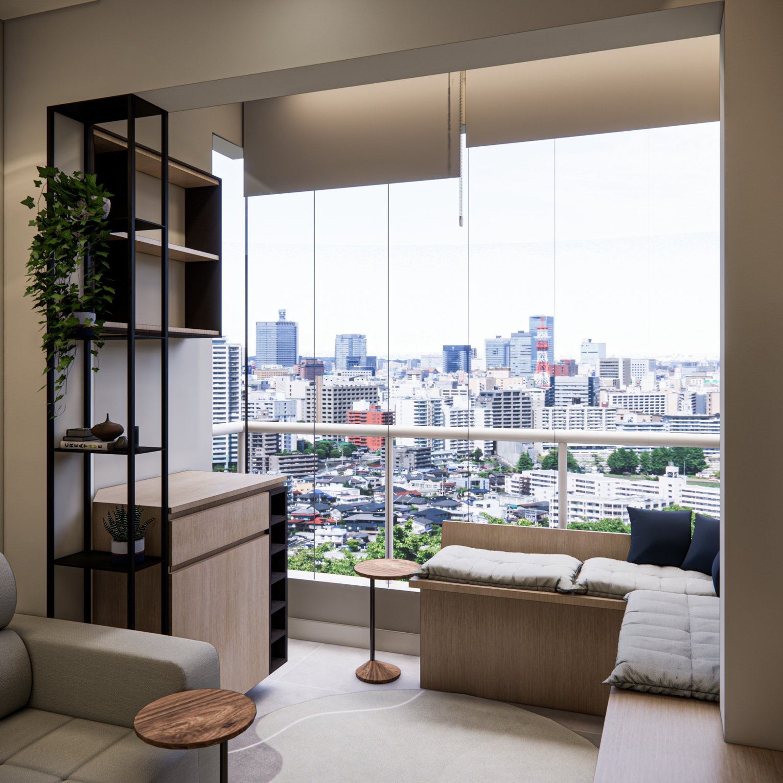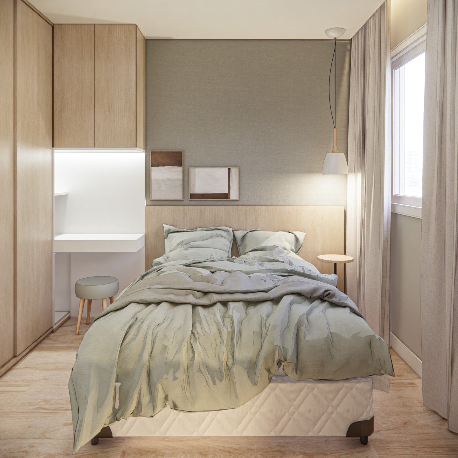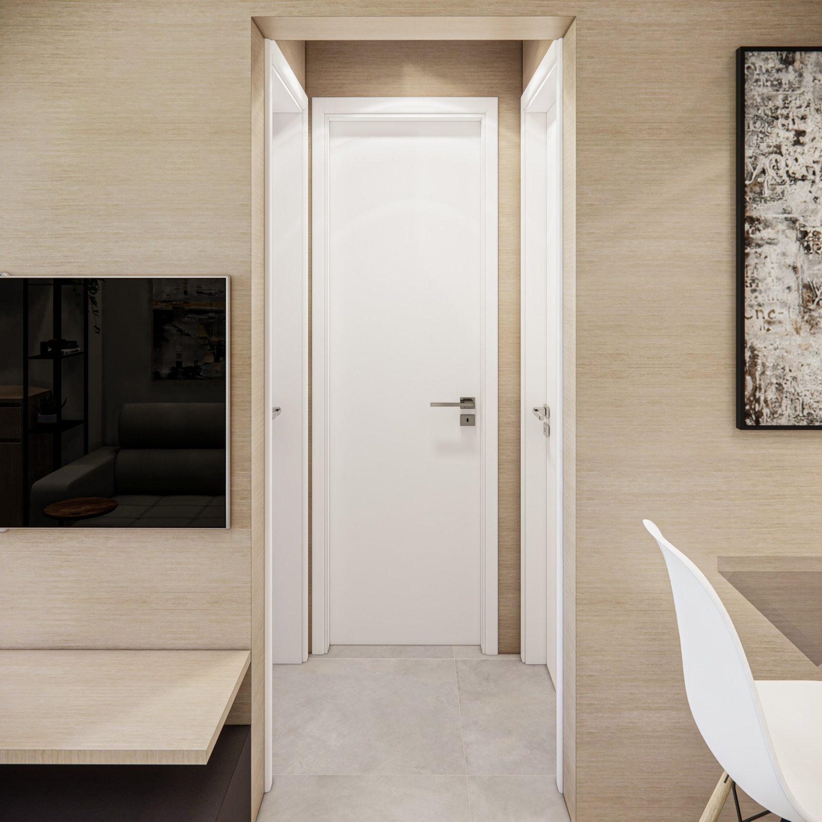 Este apartamento de 45 m² está localizado em Osasco. Optamos por usar bastante marcenaria para criar diferentes funcionalidades nos ambientes, garantindo que cada espaço tenha um uso específico. Os acabamentos são em tons neutros, com algumas cores escolhidas para adicionar personalidade ao lugar. Além disso, utilizamos quadros e uma iluminação que combina funcionalidade, conforto e um toque intimista.