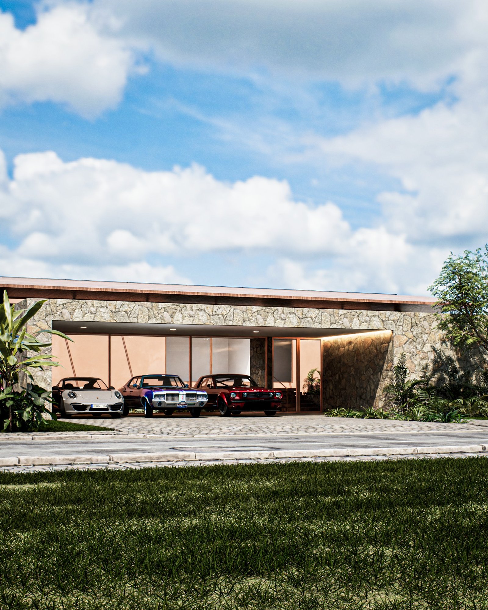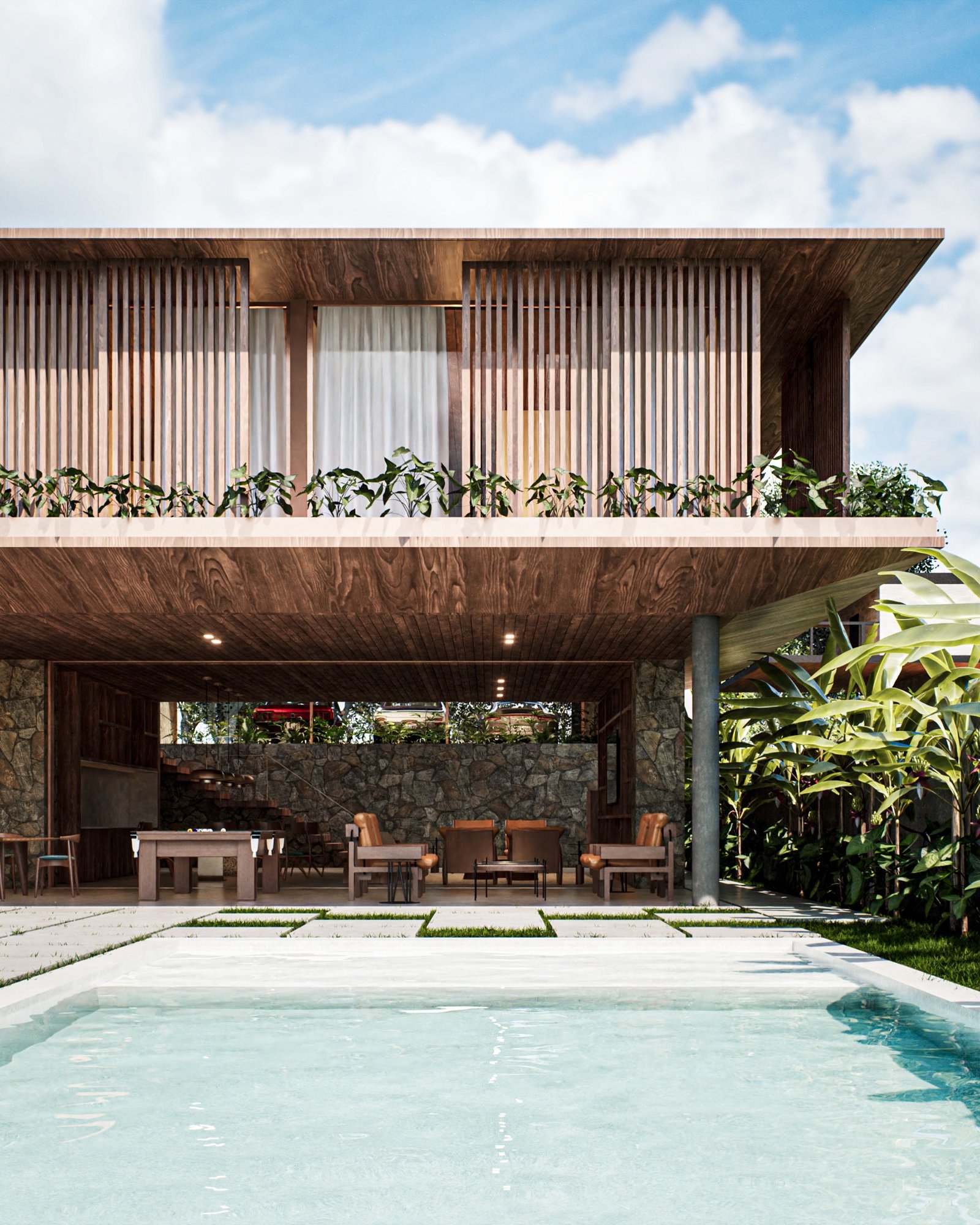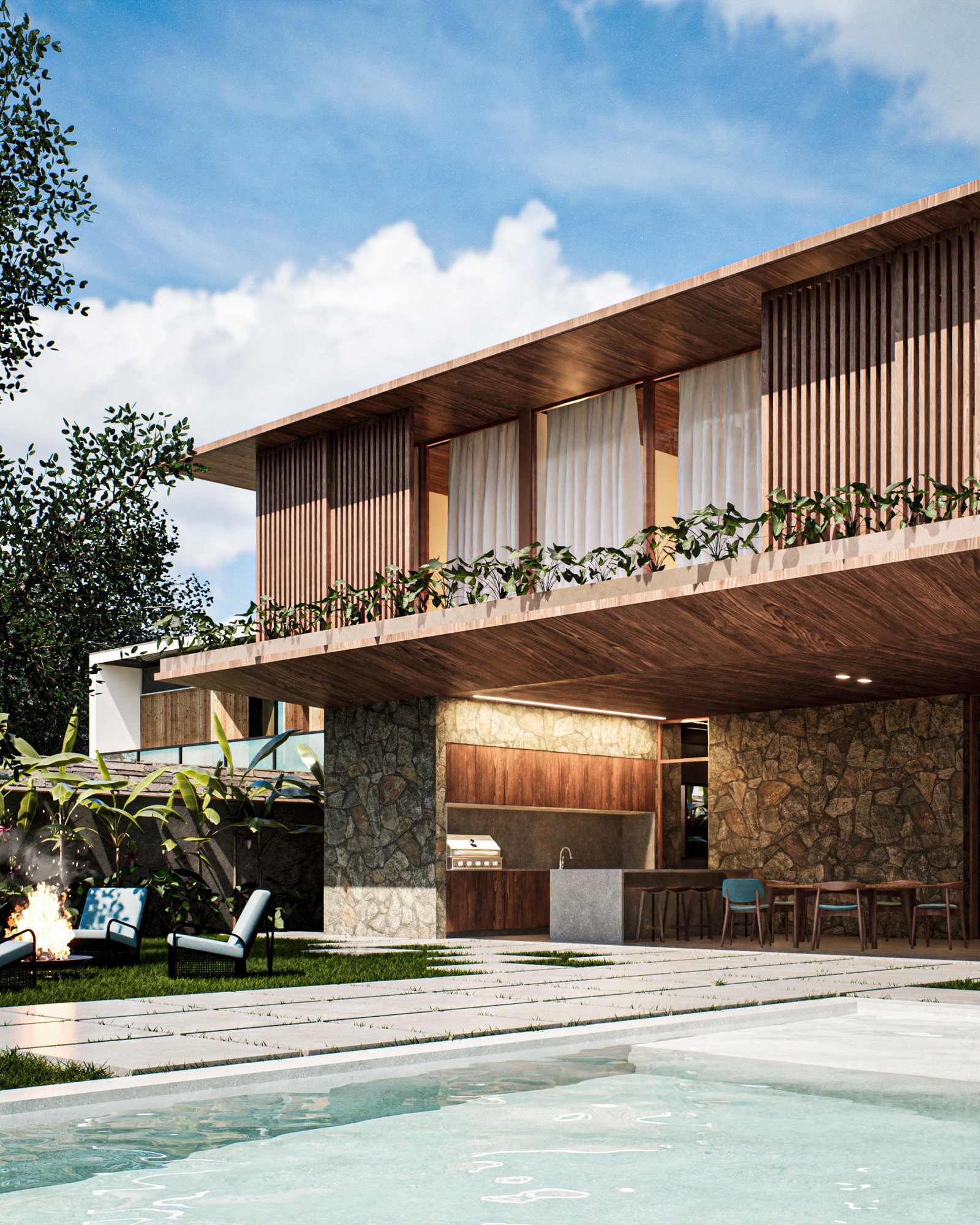 Neste projeto, nos inspiramos na arquitetura contemporânea brasileira, incorporando acabamentos como pedra moldada, concreto aparente e