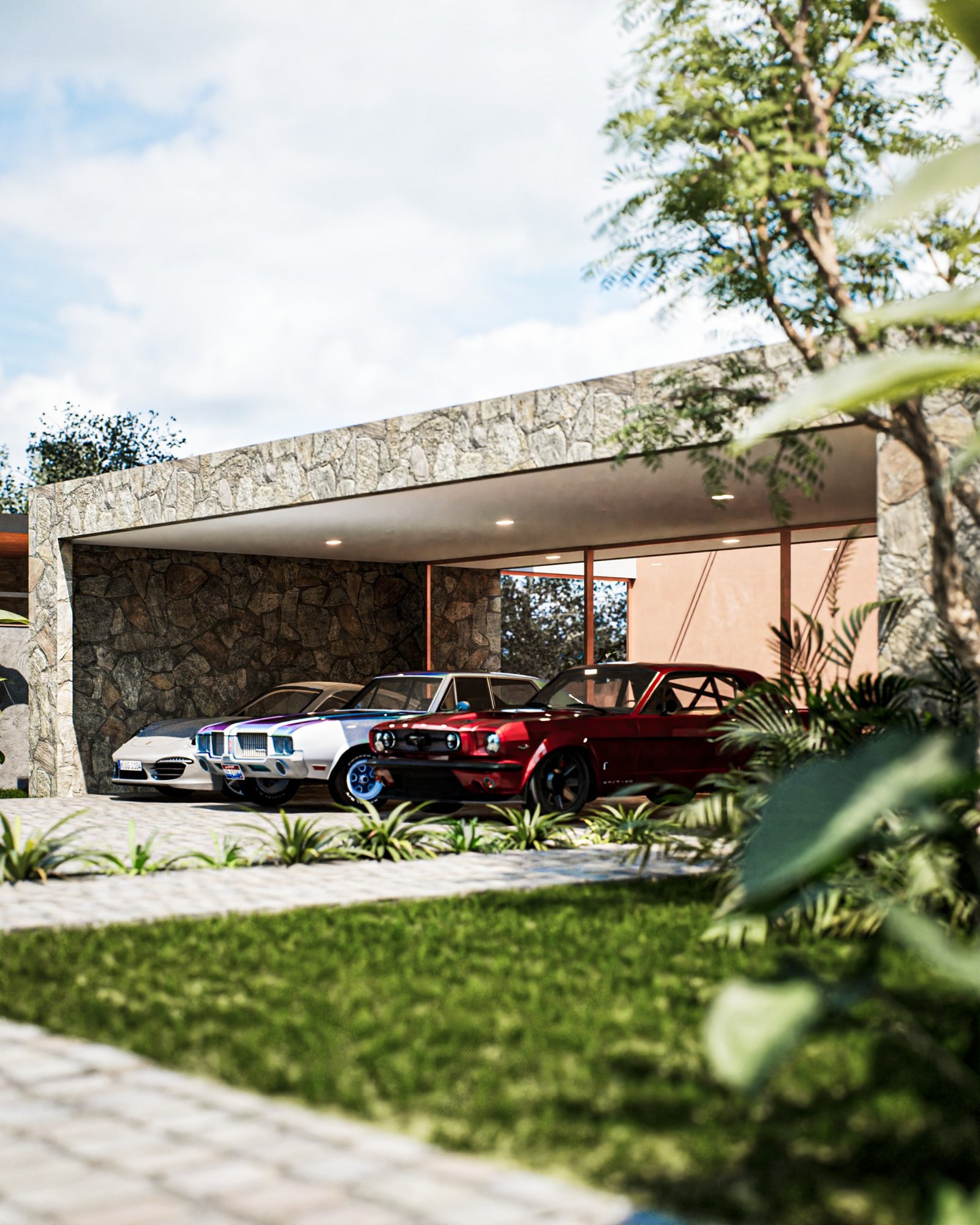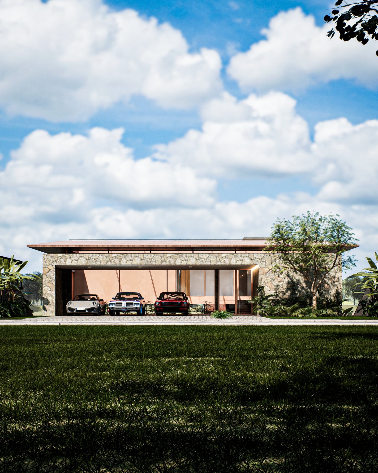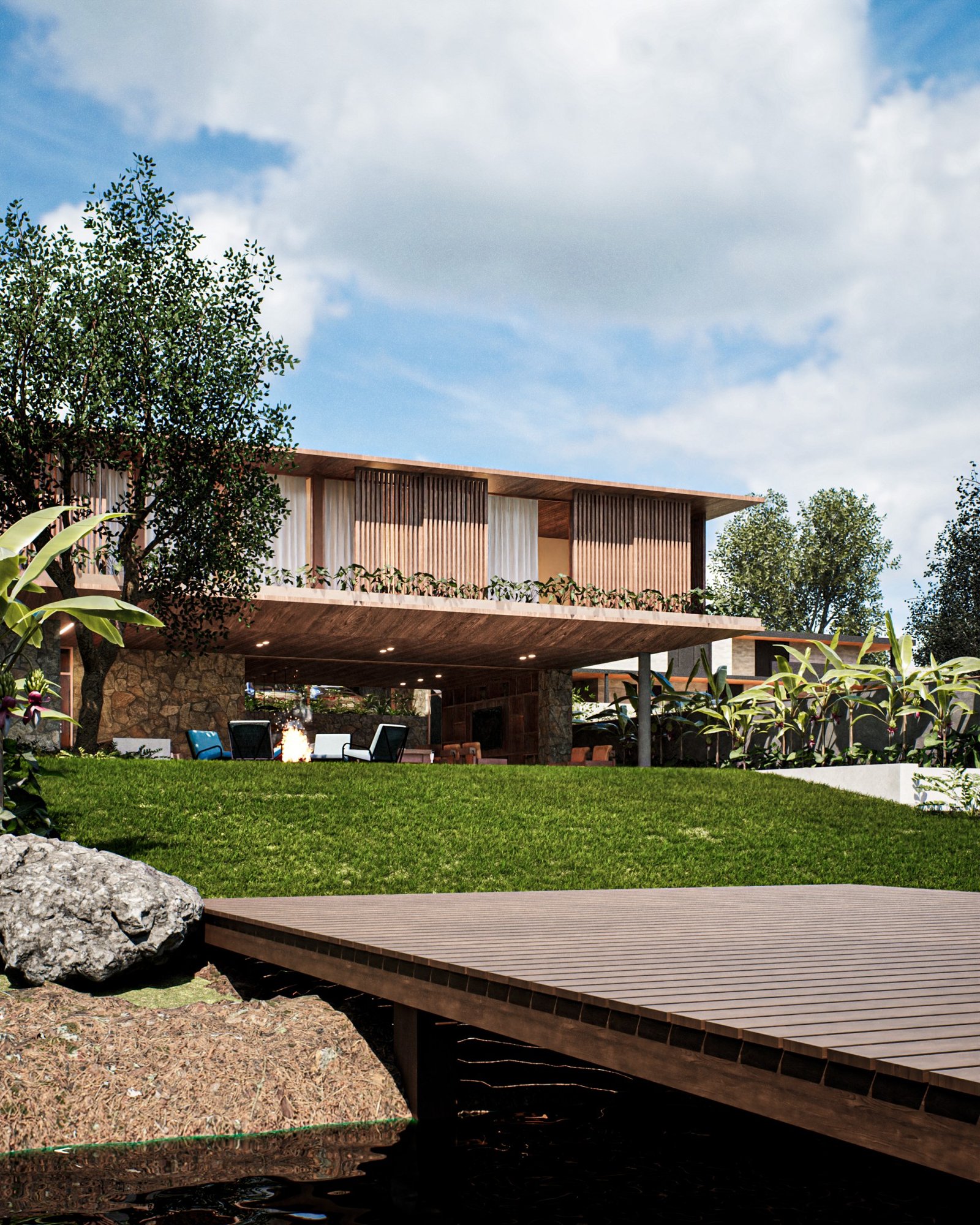 Neste projeto, nos inspiramos na arquitetura contemporânea brasileira, incorporando acabamentos como pedra moldada, concreto aparente e